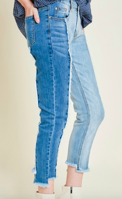 Two tone denim jeans with frayed edging. Cropped raw hemline. 5 pocket jean with zipper and button closure. 98% Cotton, 2% Spandex. #61