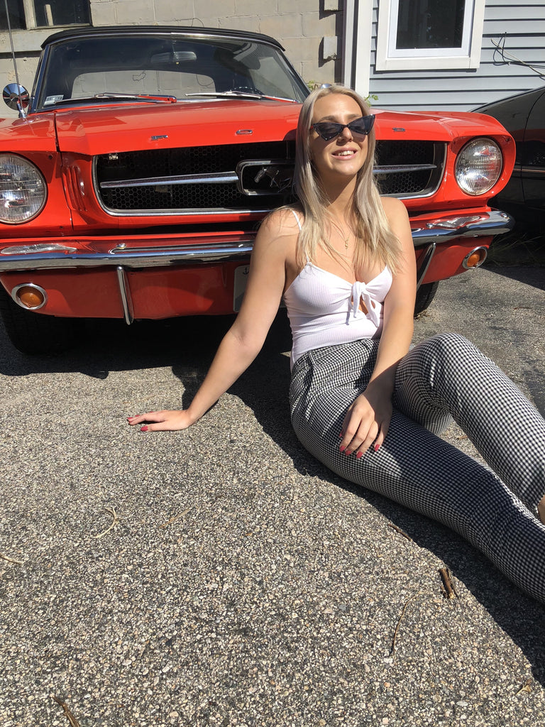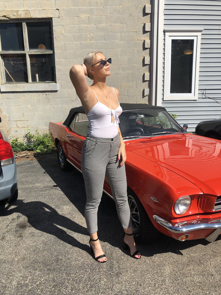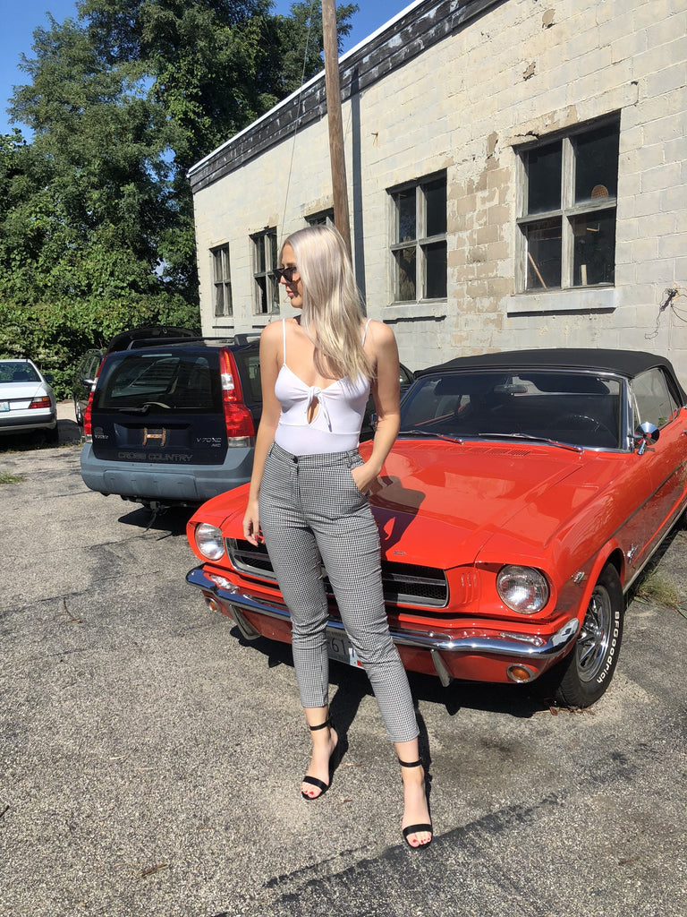 Black and white gingham pants. Tapered at bottom. These pants feature front pockets with zipper and button closure. Partial elastic waistband. 100% Cotton. #64