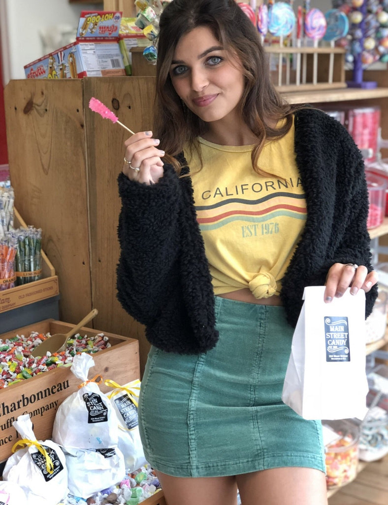 Green corduroy mini skirt with exposed back zipper. Sits above the hips. 98% Cotton, 2% Spandex. #03