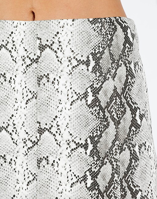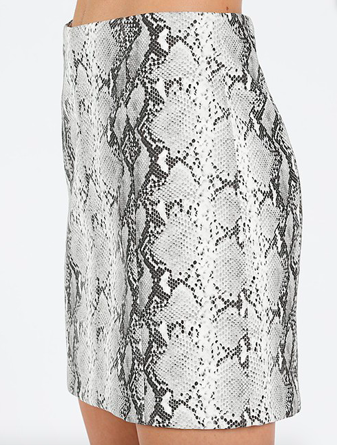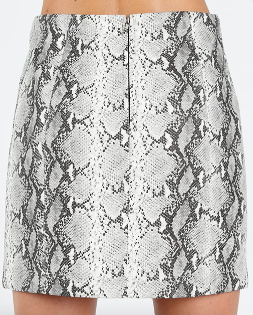 Taupe colored snake skin print skirt. 50% Polyester, 50% PU.