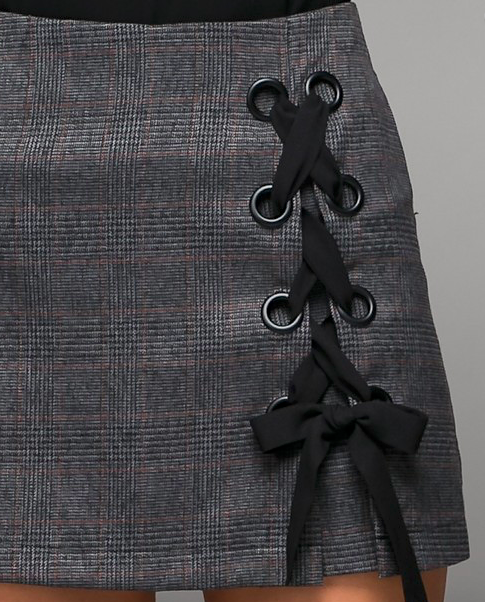 Grey plaid skort with black lace up detail in front. Matte black grommets. This skirt features a red thread detail. Shell: 65% Polyester, 35% Cotton.