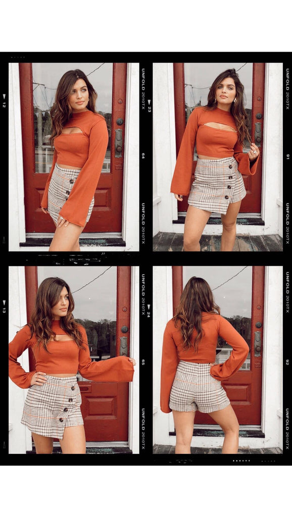 Plaid asymmetrical skort with accent side buttoned design. This skort has a hidden back zipper closure. Soft fabric. 100% Polyester. #17