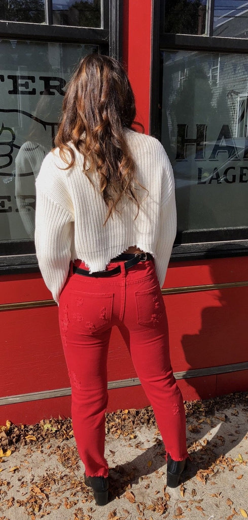 Super cool red distressed jeans with frayed hem. 5 pocket jean with front zipper and button closure. 100% Cotton. #22