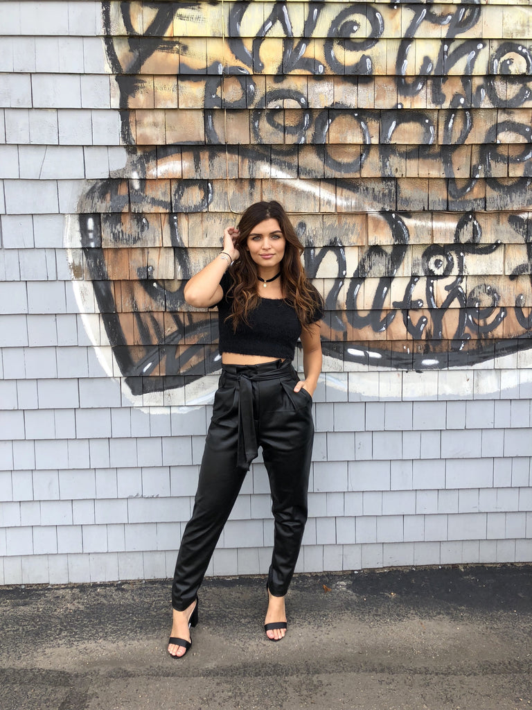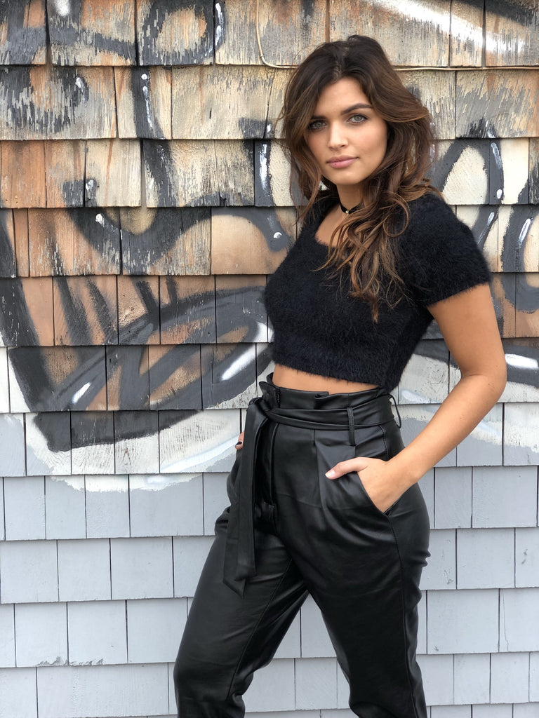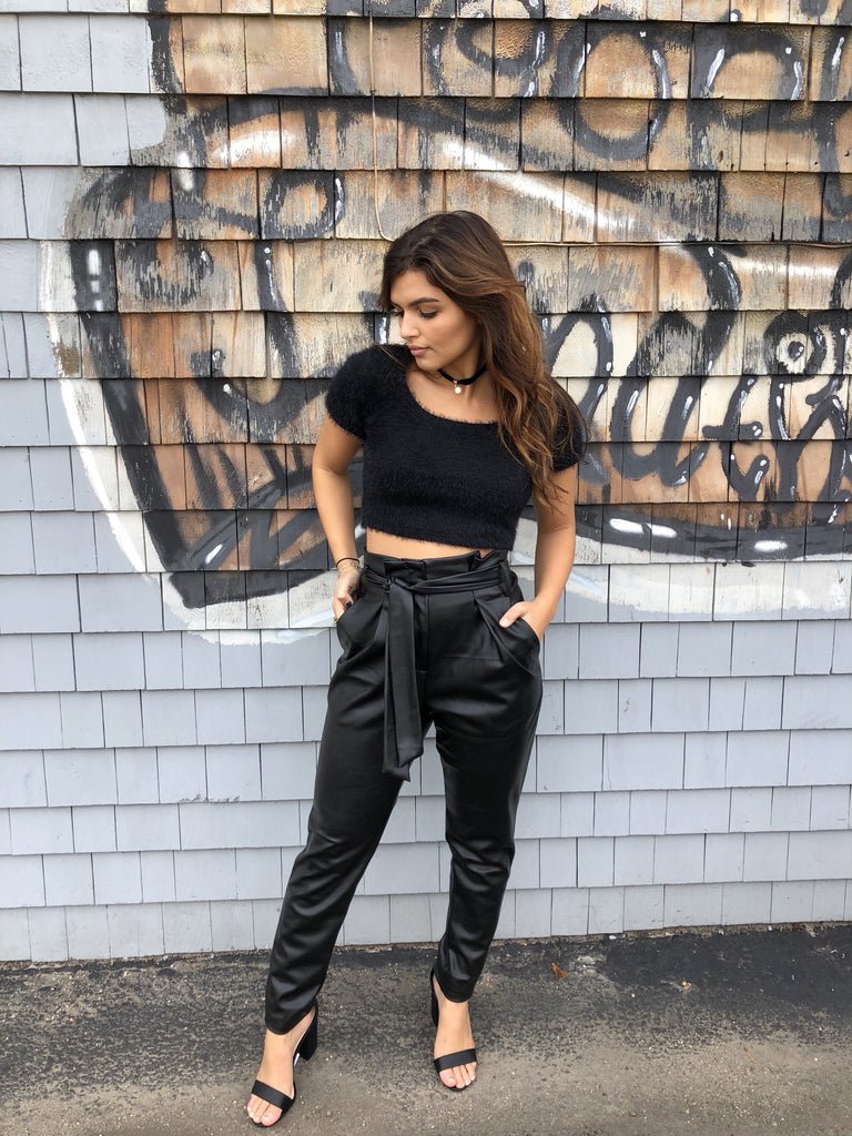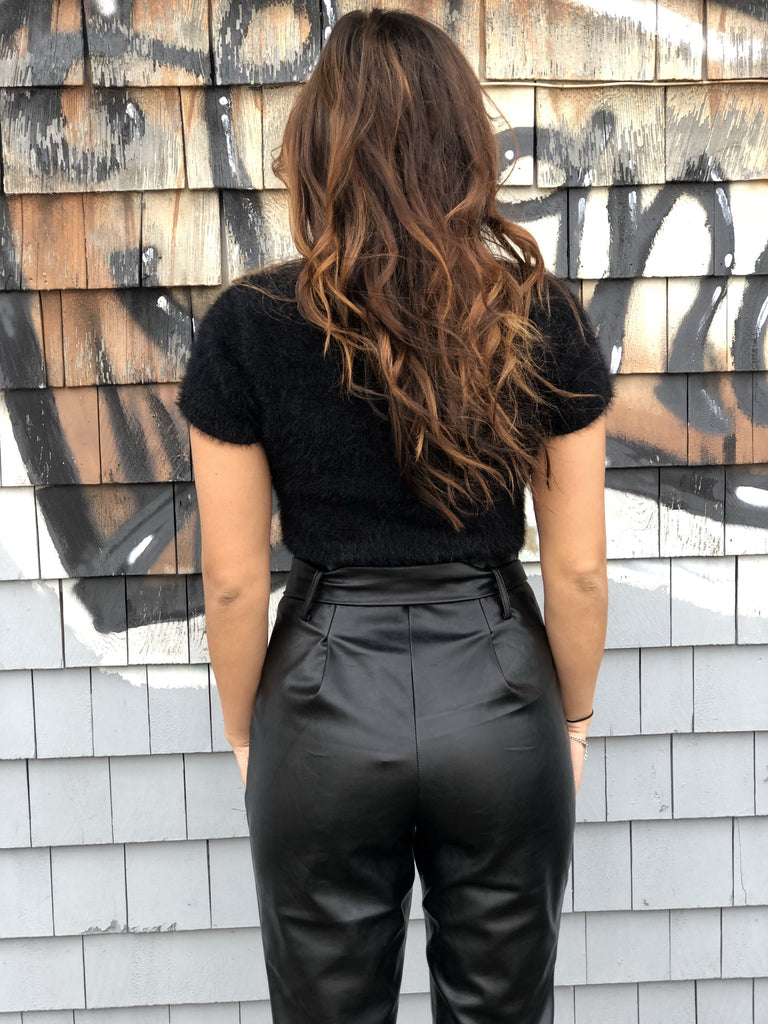 It really doesn't get much cooler than this. Black faux leather high waist paper bag style pant. This pant features two front pockets and self tie belt. Fully lined. Shell: 100% PU. Lining: 100% Polyester. #11