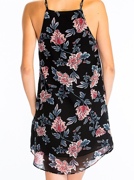 Floral print tank dress features a high neck with adjustable straps. Fully lined. Self: 100% Rayon, Lining: 100% Polyester. #11