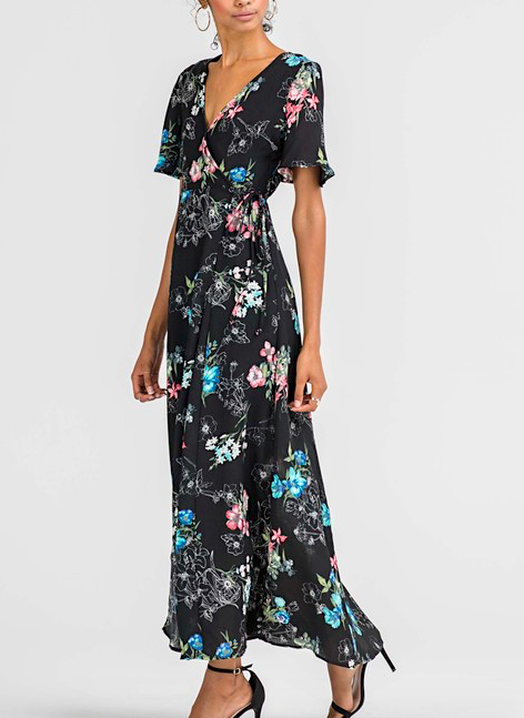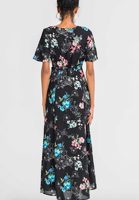Black floral maxi dress, wrap style. Self tie waist. #c1
