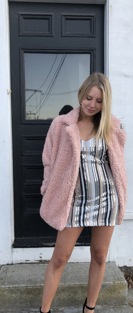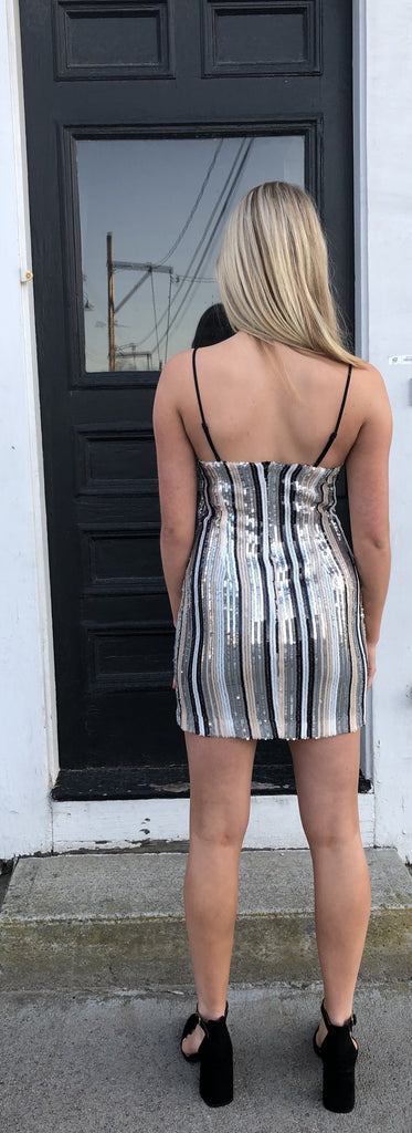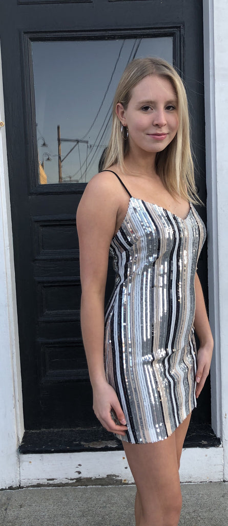 It's PERFECT! Multi color sequins dress with skinny black adjustable straps. Hidden back zipper, fully lined. Self: 100% Polyester. Contrast: 100% Rayon. Lining: 100% Polyester.