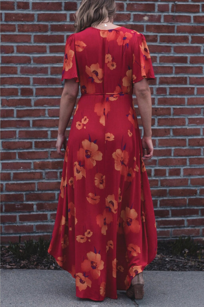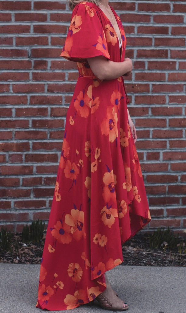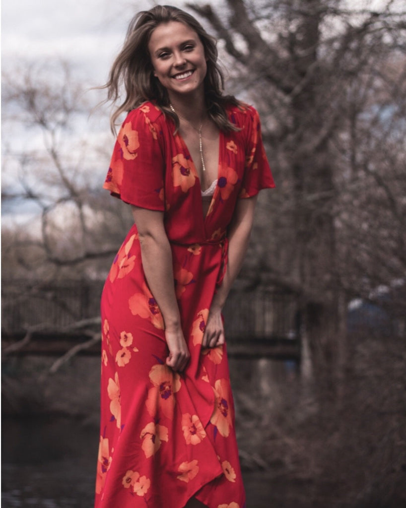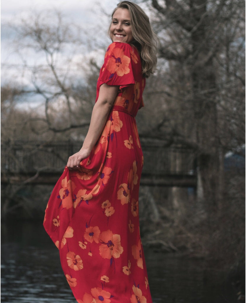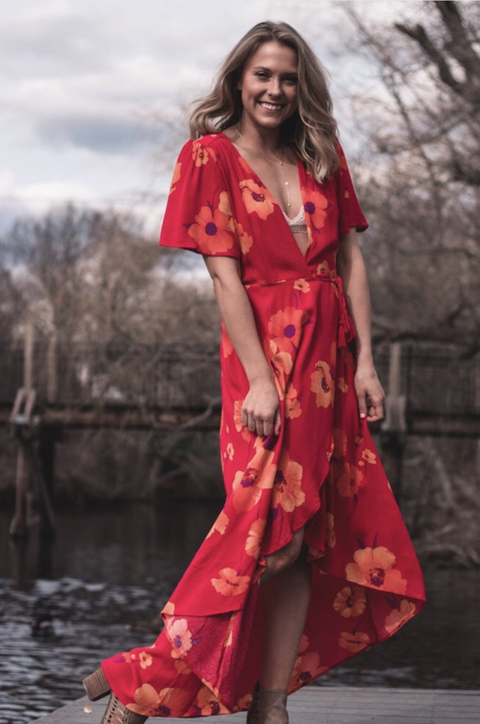 Fan favorite maxi dress! So beautiful and fluid when you move. Wrap style with self tie waist. Short sleeves with flutter detail and V neckline. 100% Rayon. #859