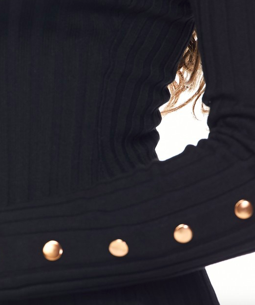 Black ribbed midi dress with snaps. Snaps on sleeves are details. Snaps on the side of the dress actually unsnap. Unsnap as little or as much as you like. Bodycon style. 70% Rayon, 30% Nylon. #19