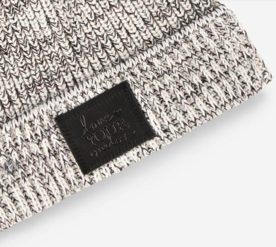 This lightweight beanie hat is knit in natural and black colors and features a black leather patch debossed with the Love Your Melon logo. One size fits all.