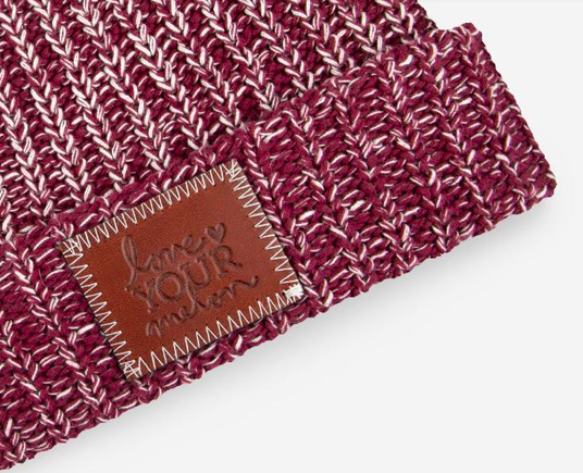 This 100% cotton cuffed beanie hat is knit in burgundy and natural yarn colors and features a brown leather patch debossed with the Love Your Melon logo. One size fits all. Machine washable.
