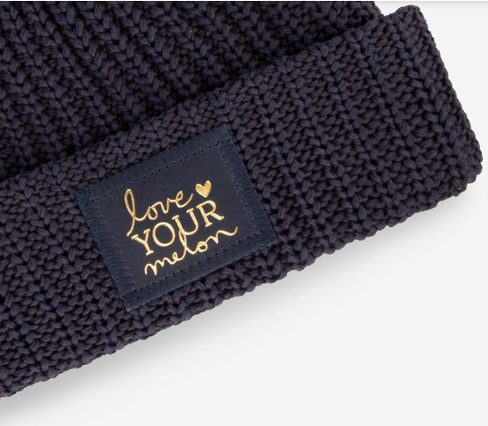 This cuffed beanie hat is knit in charcoal and navy colors and features a navy leather patch debossed with the Love Your Melon stacked logo in gold.