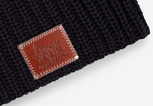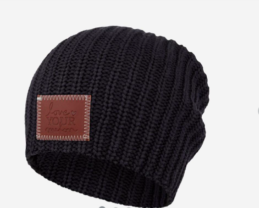 This 100% cotton beanie hat is knit in a black yarn color and features a brown leather patch debossed with the Love Your Melon logo. One size fits all. Machine washable. #bb