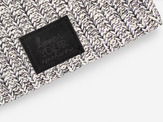 This 100% cotton beanie hat is knit in black and natural yarn colors and features a black leather patch debossed with the Love Your Melon logo. One size fits all. Machine washable. Made in USA! bsbl