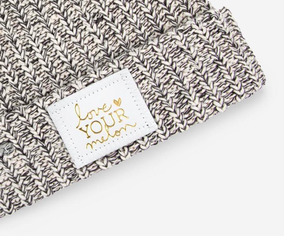 This 100% cotton cuffed beanie is knit in natural and black yarn colors and features a white leather patch debossed with the Love Your Melon logo in gold. One size fits all. Machine washable. #bsw