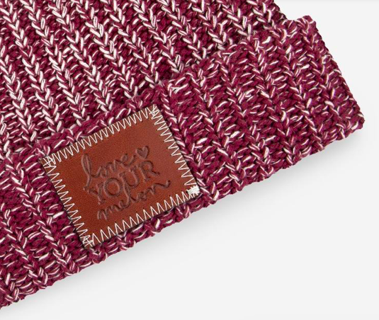 This 100% cotton cuffed beanie hat is knit in burgundy and natural yarn colors and features a brown leather patch debossed with the Love Your Melon logo. One size fits all. Machine washable. Made in USA! #bnsl