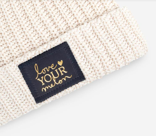 This cuffed beanie hat is knit in natural and white yarn colors and features a navy leather patch debossed with the Love Your Melon stacked logo in gold. Made in USA! #wsgf