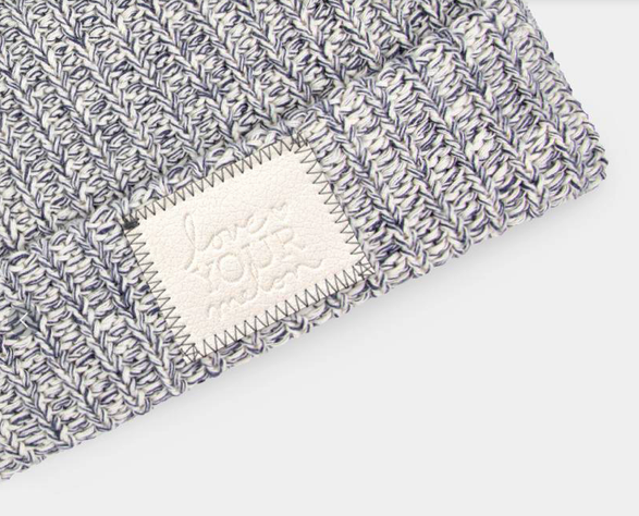 This 100% cotton cuffed beanie hat is knit in natural and navy yarn colors and features an off-white faux leather patch debossed with the Love Your Melon logo. One size fits all. Machine washable. Made in Minneapolis, Minnesota. #NS