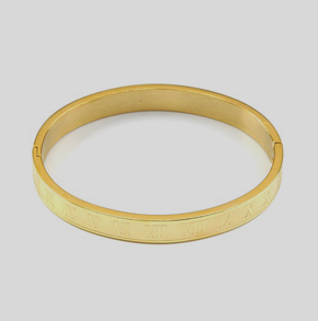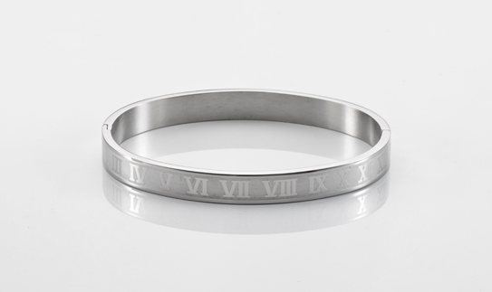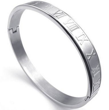 Stainless steel oval bangle with roman numerals. Has closure. 5/16 of an inch thick.