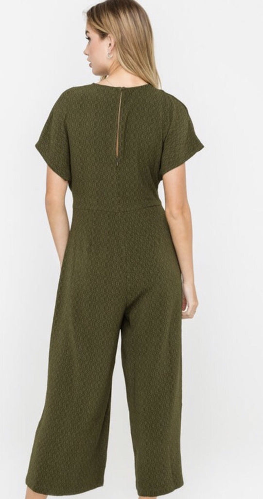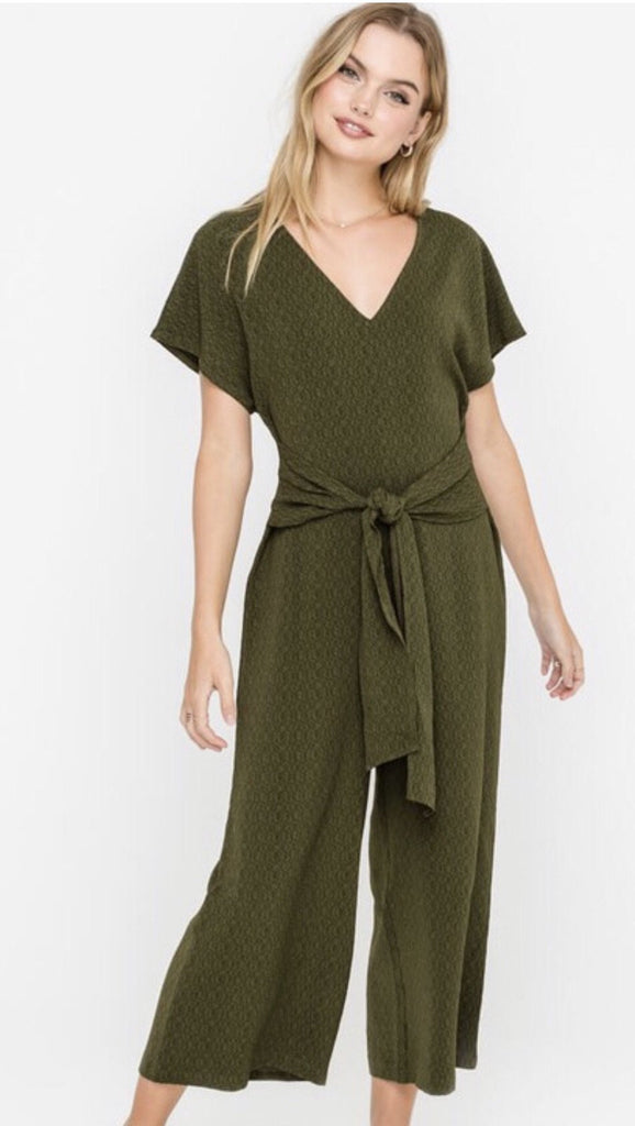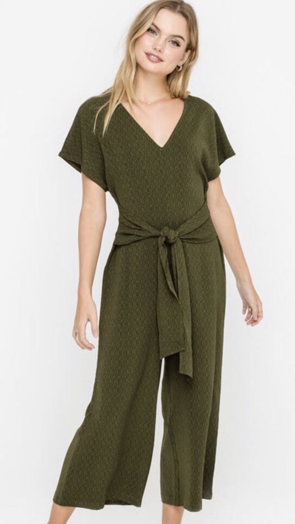 Short sleeve jumpsuit with accent tie to define a waistline. V neckline and keyhole back detail with hidden zipper. 96% Polyester, 4% Spandex.