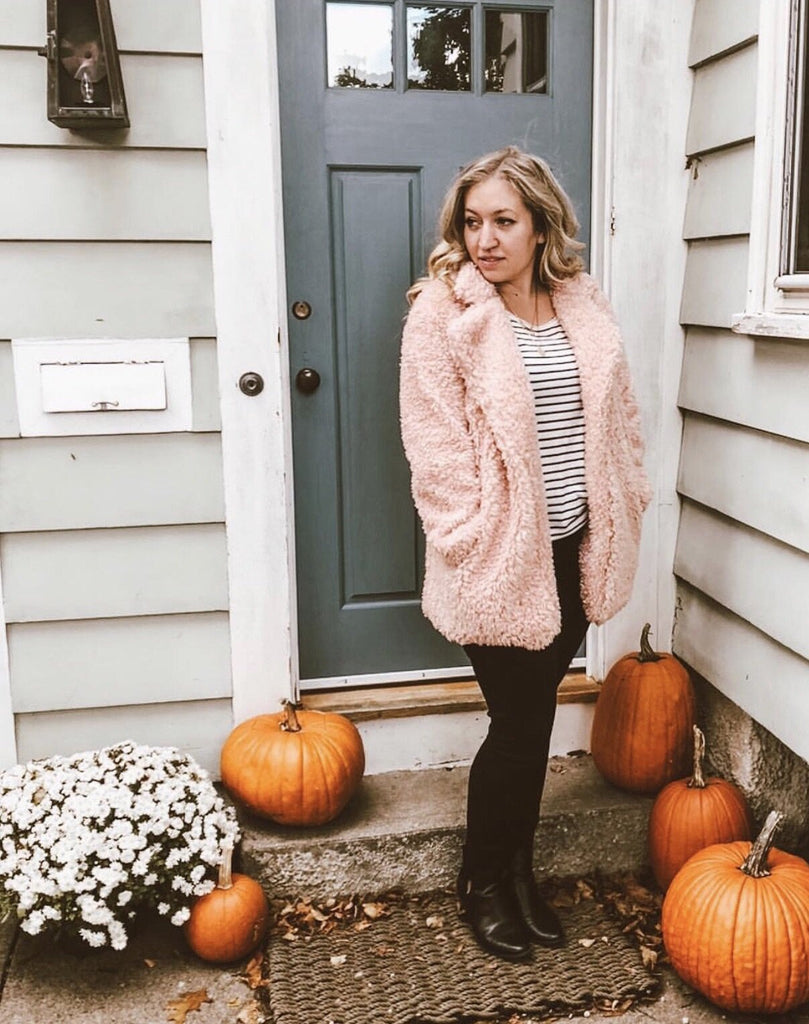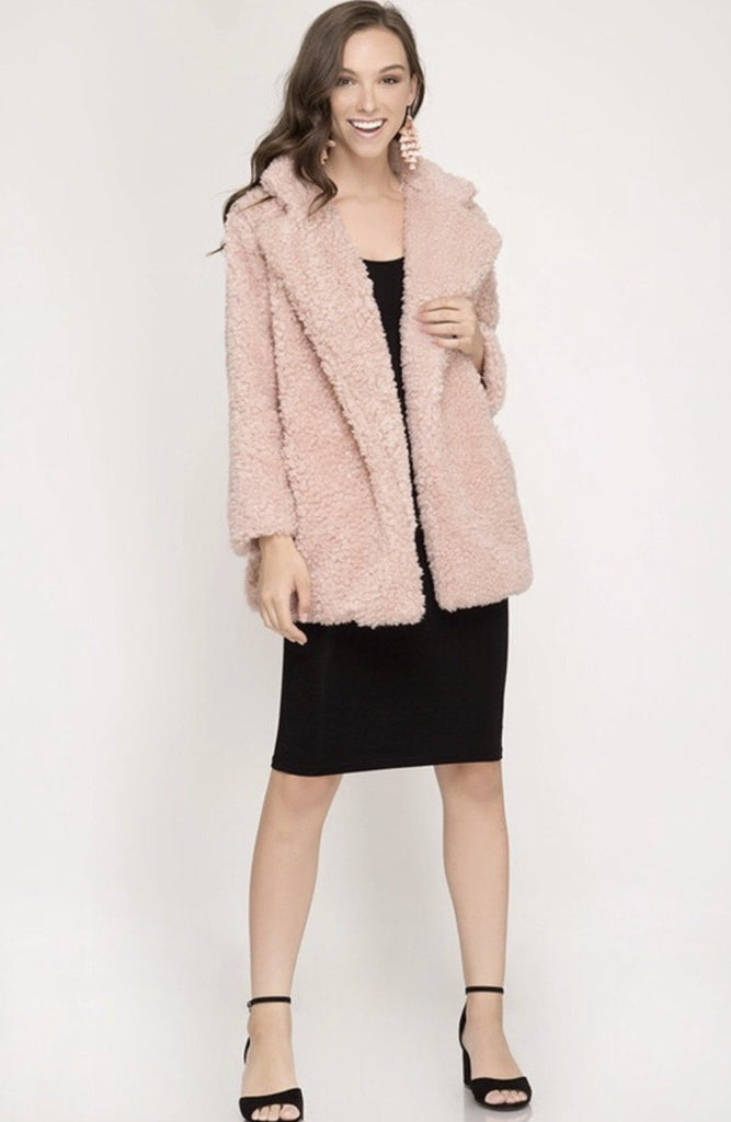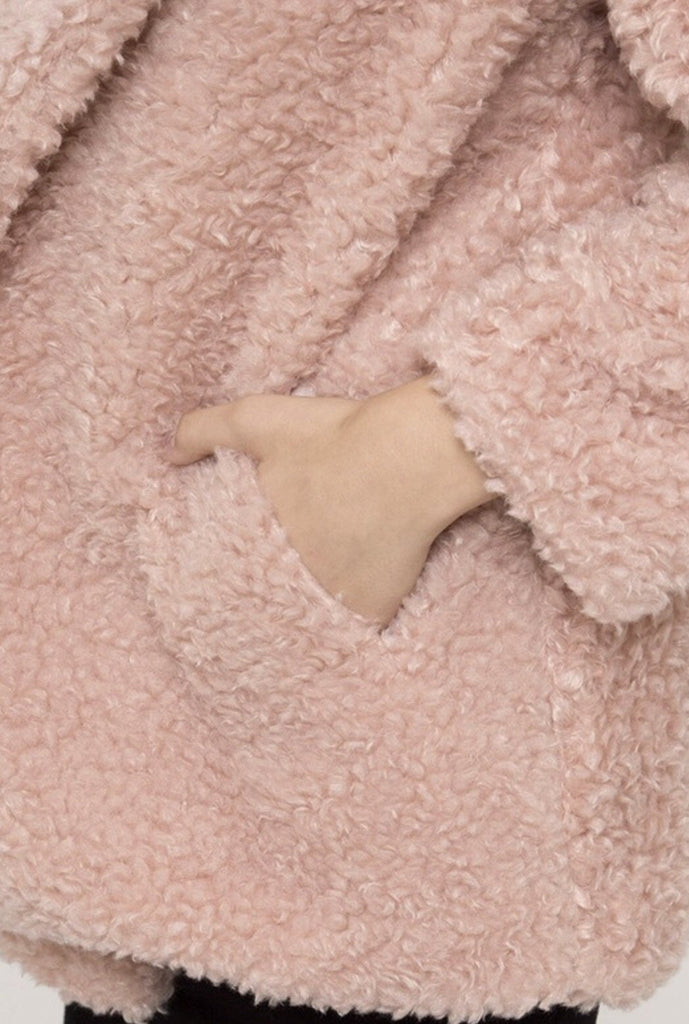 Misty pink teddy bear open jacket with pockets. 100% Polyester.