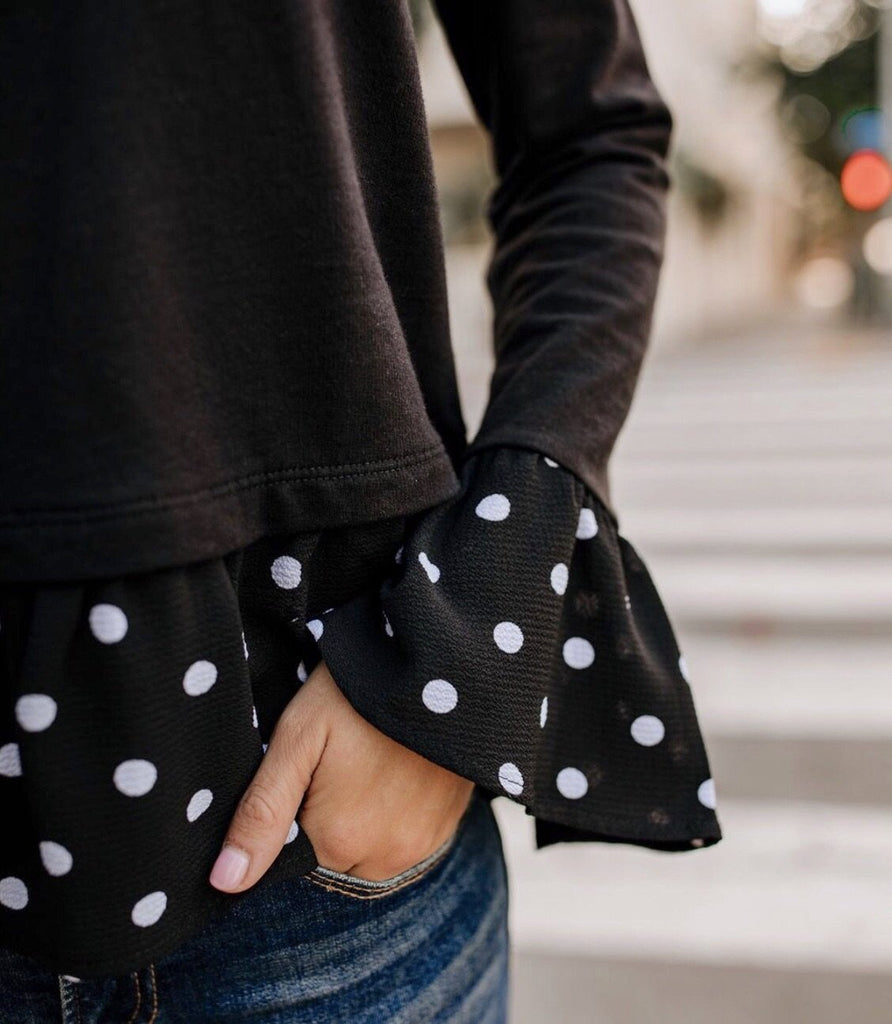 Black long sleeve knit top with a contrasting polka dot woven ruffle.  Fun and comfortable!  100% Polyester.  #45