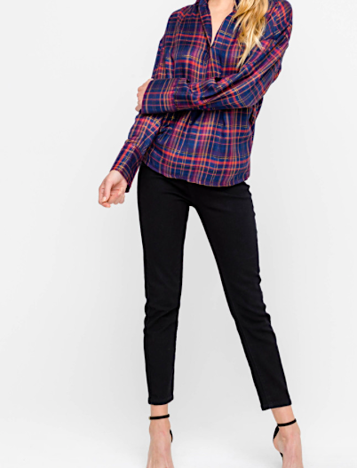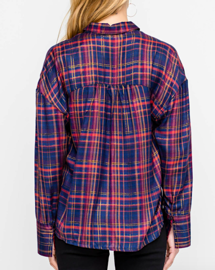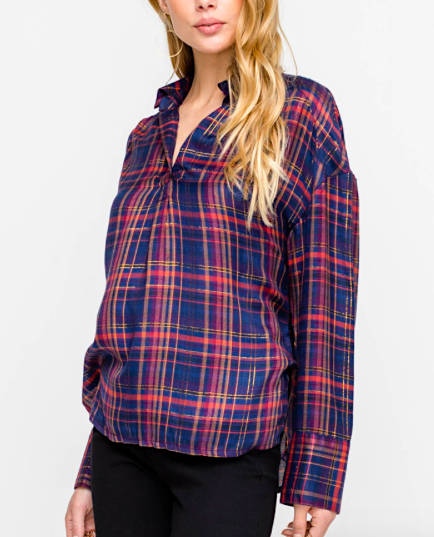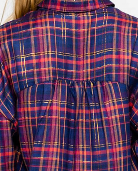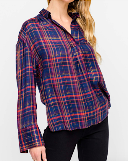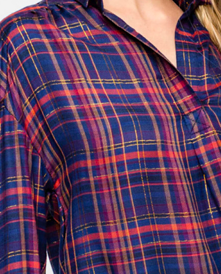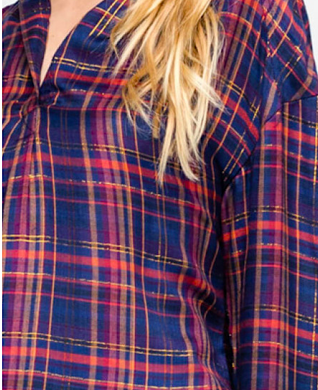 Navy plaid long sleeve top with gold metallic thread. V neck style with collar. Button cuff at sleeve. 95% Cotton, 5% Lurex. #14