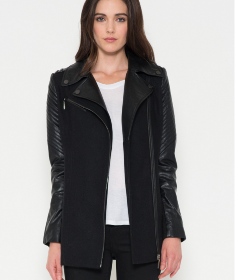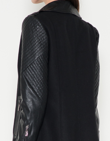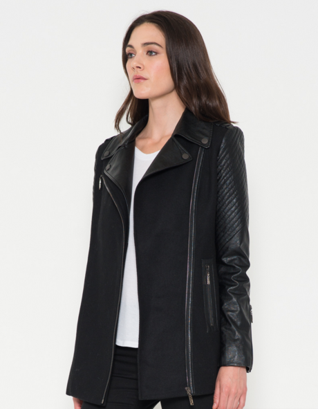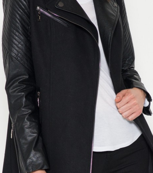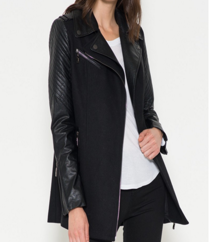 A beautifully constructed vegan leather moto coat with asymmetrical zipper front and two zippered side pockets. Self: 90% Polyester, 10% Rayon. Trim 1: 55% Cotton, 45% PU. Trim 2: 90% Polyester, 10% Spandex. Lining: 100% Polyester.