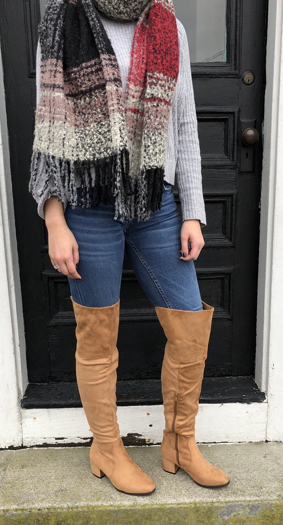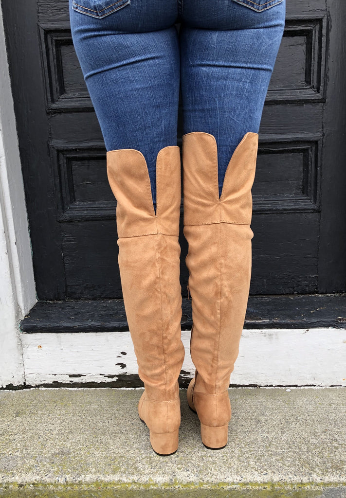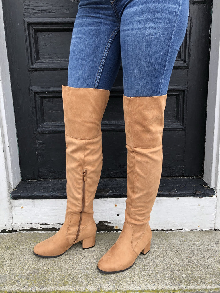 Brown faux suede over the knee boot. These boots are lined with padding and have a 12” inner zipper on the side. The heel height is 2” with a leg opening of 8”. 4.5”slit on the middle of the back.