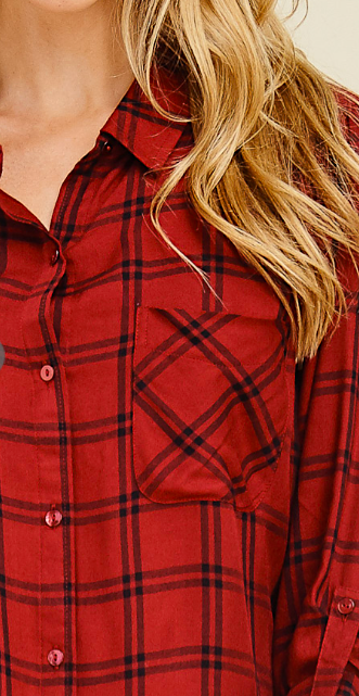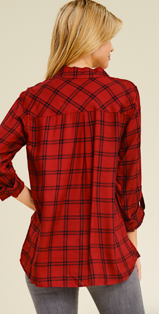 Burgundy and black plaid basic collar button down.  This top features a chest pocket and roll tab sleeves.  100% Rayon.  #75