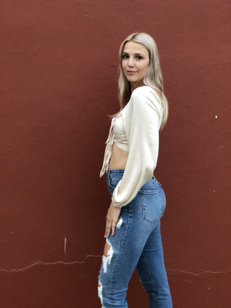 Ivory crop top with front cutouts and self tie knot closure. 100% Rayon. #00