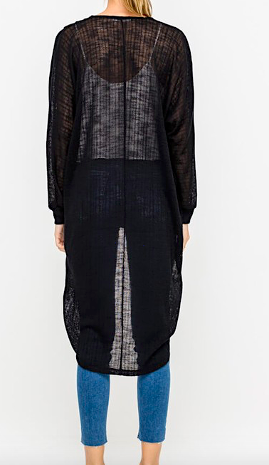 Black long sleeve light weight cardigan sweater. Thin sheer knit fabric with a rounded cocoon hemline. Cinched details at the shoulder and dolman sleeves. 96% Polyester, 4% Spandex. Made in USA! #01