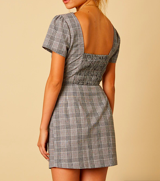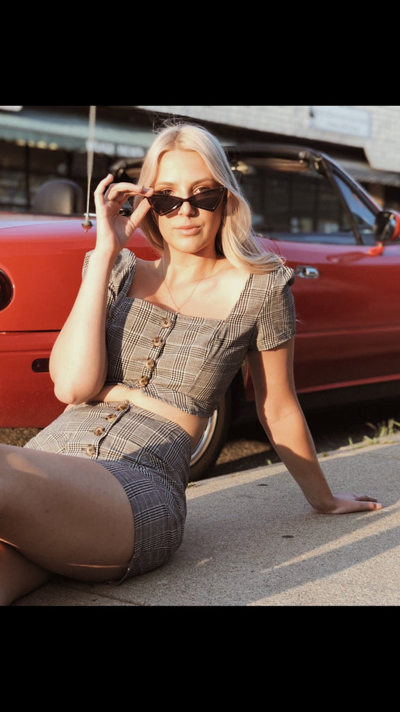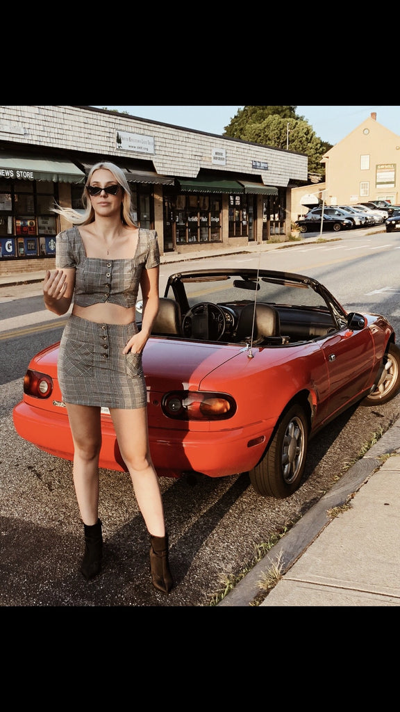 Two piece set featuring button front glen plaid crop top and high-waisted mini skirt with front pockets and tortoise shell buttons. 70% Cotton, 30% Linen. #51. Sold as a set.