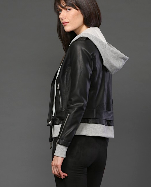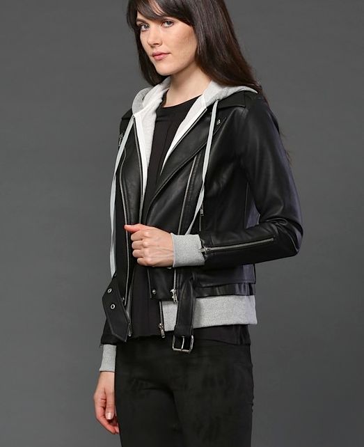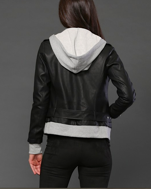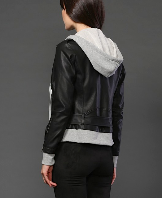 Amazing! Faux leather jacket with grey knit hoodie contrast. One piece looks like two. Sweatshirt part zips up and leather part zips up. Drawstring hoodie pull to tighten. Jacket has real pockets and buckle closure. #72