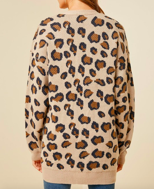 Leopard knit cardigan sweater with front pockets. 100% Acrylic. #75