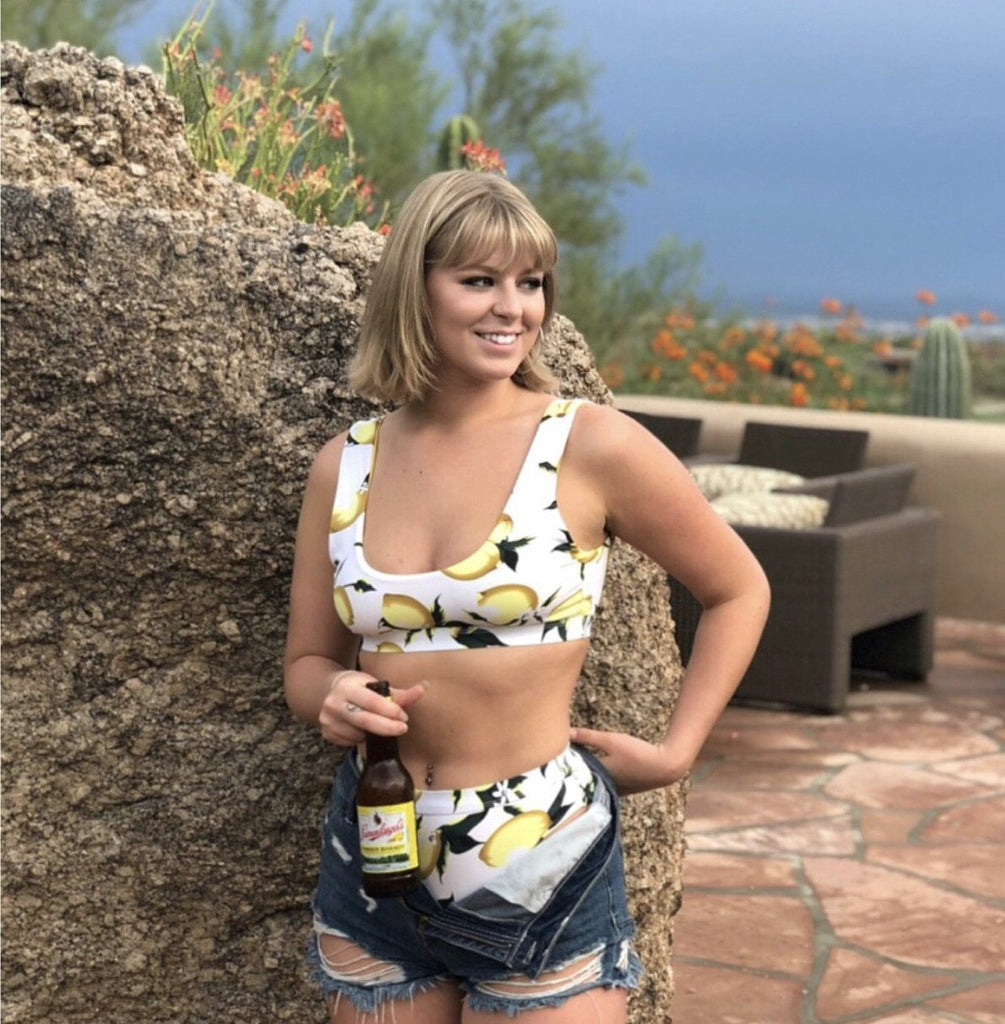 Lemon print sport top bathing suit. Seamless fabric with thick straps and elastic band. 80% Nylon, 20% Spandex.