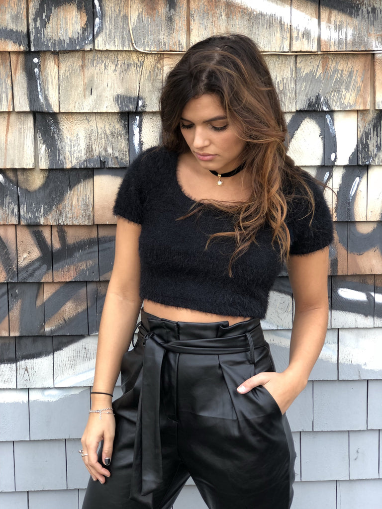 Black short sleeve fuzzy sweater crop top. 65% Nylon, 35% Acrylic. #84