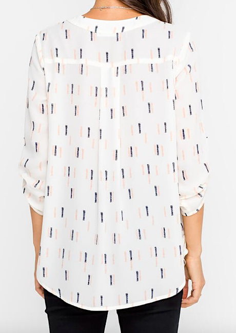 Cream and navy printed blouse. V neckline with epaulettes on sleeves. This top features a rounded hemline that tapers up at the sides. 100% Polyester. #89