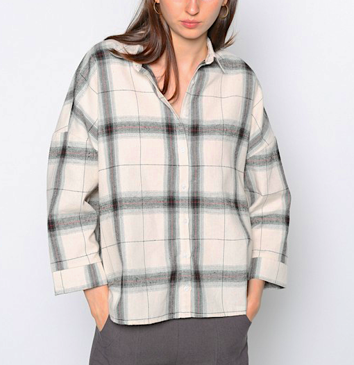 Ivory checkered plaid top with 3/4 sleeve. Button down style. 100% Cotton. #37