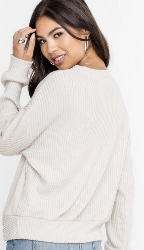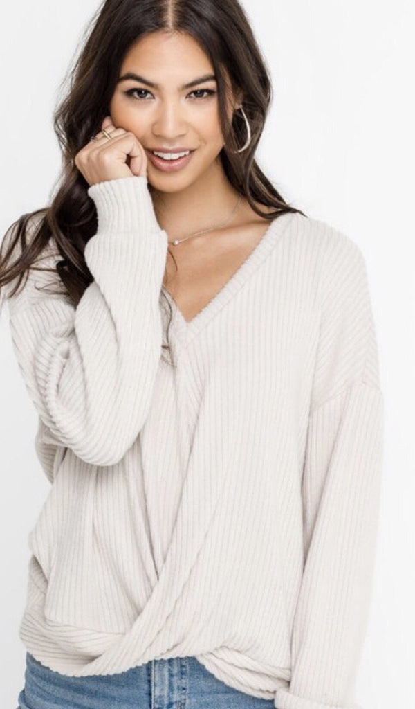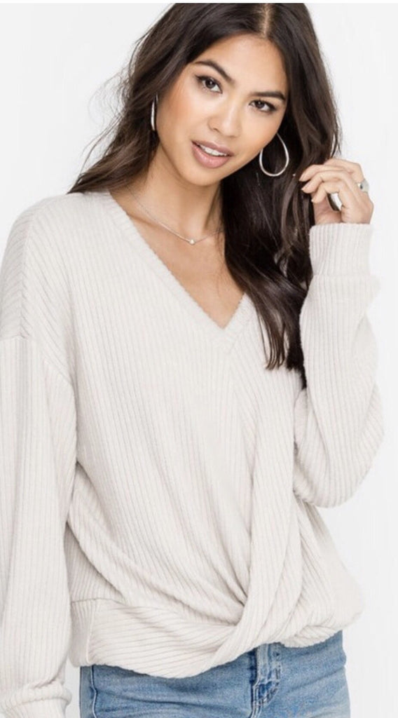 Oatmeal colored long sleeve pullover sweater. This top features a draped and layered bottom hem design and v neckline. Ribbed fabric with a drop shoulder and relaxed fit, super soft! 65% Rayon, 31% Polyester, 4% Spandex. #8b