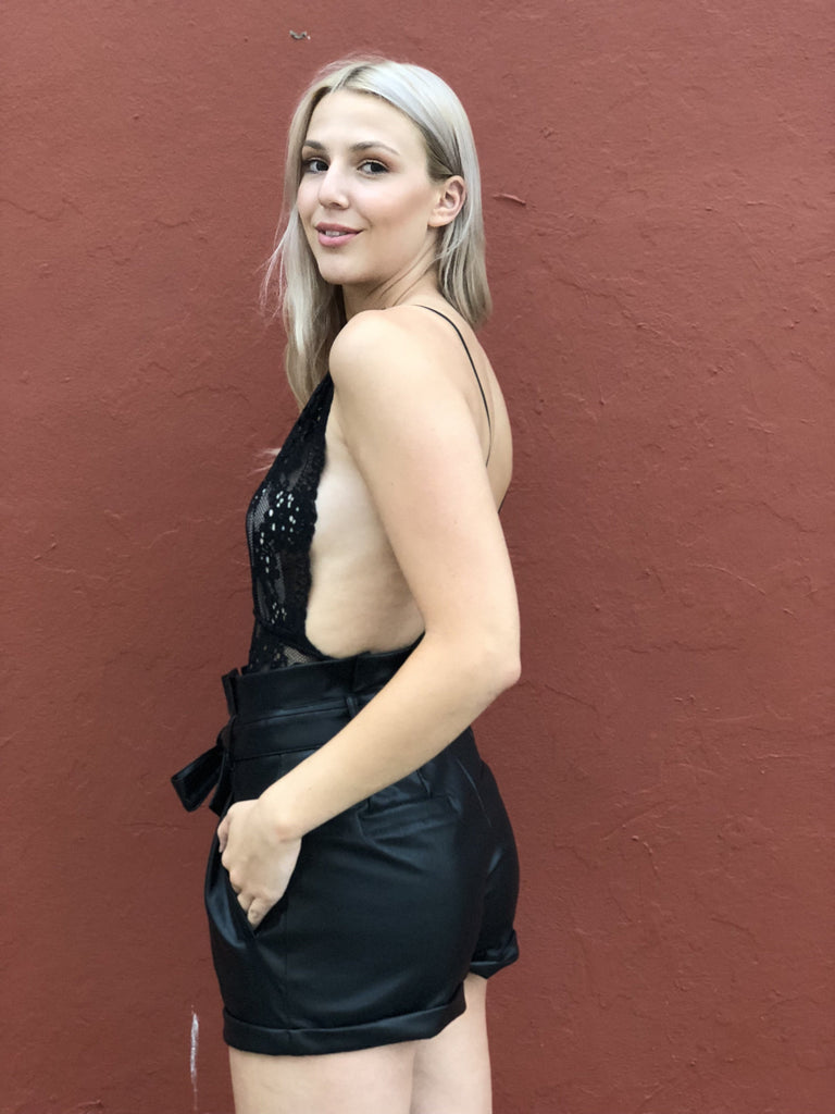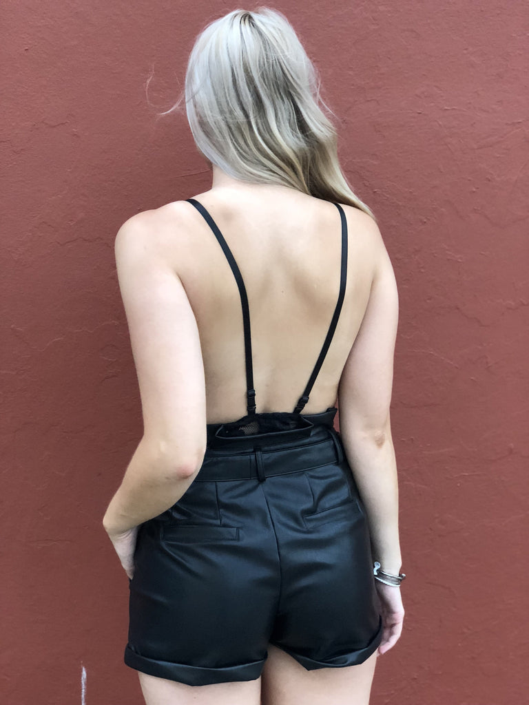 Super sexy black lace bodysuit with plunging V neck and deep back. The straps are adjustable changeable, wear them straight or criss cross. Front chest is lined with nude fabric. Snap closure. 90% Polyester, 10% Spandex.