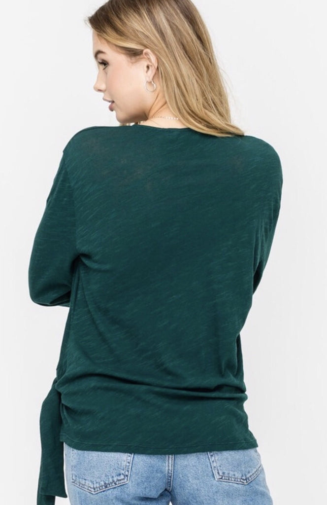 Pine colored long sleeve wrap style pullover top in a thin heathered knit fabric. Slightly draped front design with a bottom side tie accent. 100% Cotton. #67
