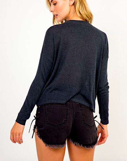 Dark teal long sleeve sweater featuring dolman sleeves and a relaxed fit.  66% Acrylic, 24% Nylon, 10% Angora.  #73